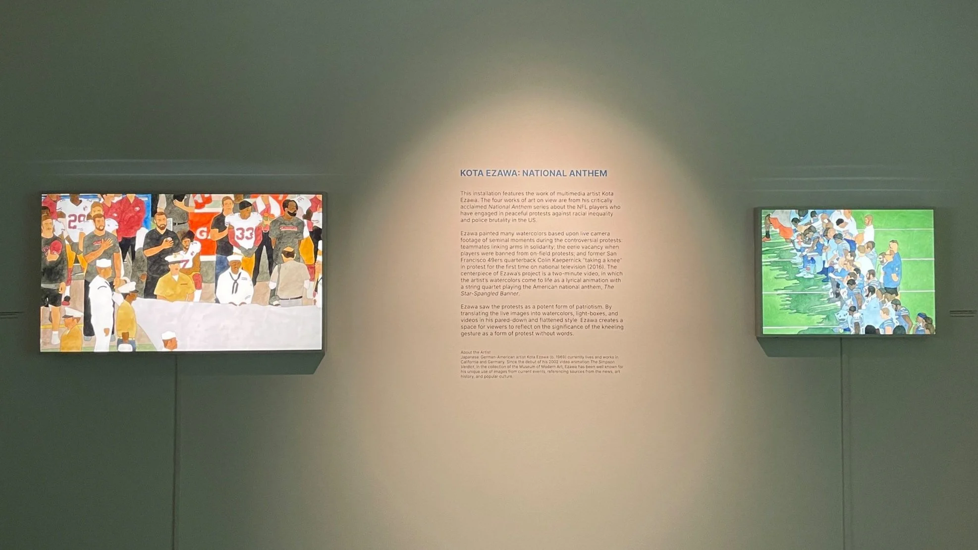 The Memorial Art Gallery (MAG), the University of Rochester’s art museum, partnered with the university’s Brain & Cognitive Sciences Department to explore how visitors perceive the National Anthem exhibit by artist Kota Ozawa. This exhibit features NFL athletes who engaged in peaceful on-field protests in 2016 to protest police brutality against people of color in the United States.